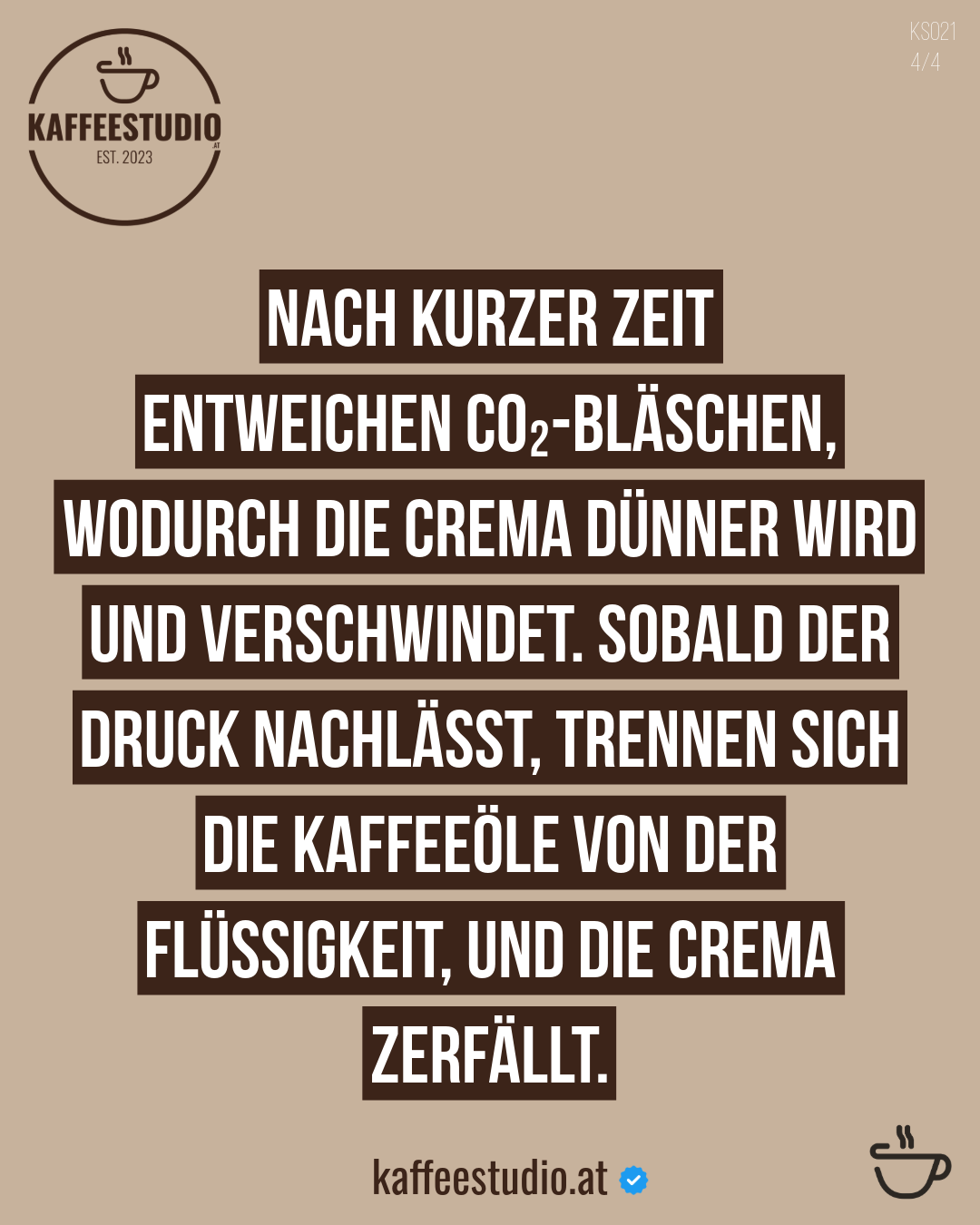 NACH KURZER ZEIT ENTWEICHEN CO2-BLÄSCHEN, WODURCH DIE CREMA DÜNNER WIRD UND VERSCHWINDET.